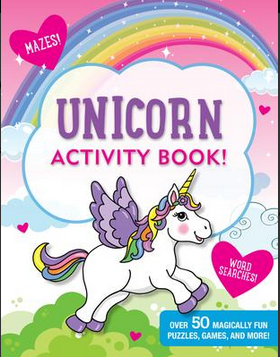 Colorful activity book is filled with unicorn-themed mazes, word searches, coloring, and more!
