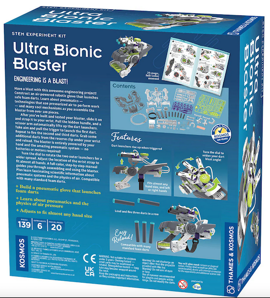 Have a blast with this awesome engineering project! Construct an air-powered robotic glove that launches safe foam darts. Learn about pneumatics — technologies that use pressurized air to perform work — and many cool mechanisms as you assemble the blaster from over 100 pieces.