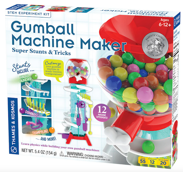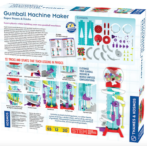 Super sweet stunts! Build your own gumball machines and learn physics lessons in the process. A turn of a handle dispenses one gumball at a time out of the clear storage globe and down the track. The gumballs land in a collection cup and can easily and sanitarily be returned to the globe for another run. The track segments can be moved around on the base to create an almost limitless number of different gumball machines. As the gumballs roll down the track, they perform cool stunts and tricks. Stunts include a pulley lift, pendulum, funnel, trampoline, variable-slope ramp, pinball launcher, and domino slide. Each segment of the track teaches a different lesson in mechanical physics, allowing users to explore topics including simple machines, force, motion, momentum, gravity, Newton’s laws, energy transfer, and more.