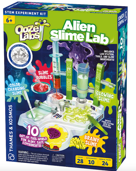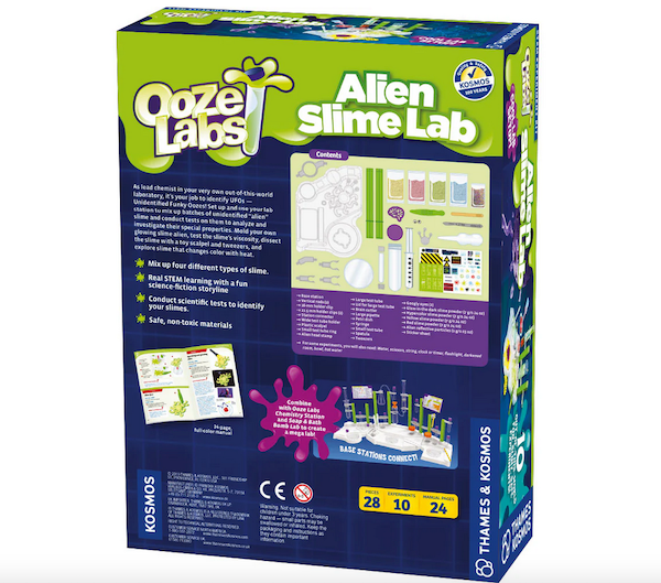 The kit comes with all the tools needed to set forth on your alien slime research mission. Use the syringe to conduct viscosity tests, roll the slime with a roller, and dissect it with tweezers and a plastic scalpel. Cut a brain shape out of the slime, stamp it with an alien head, and add eyes to it! Explore your slimes’ make-up and properties — like their different colors, glittery components, and glowing and color-changing effects — and then use your findings to correctly identify the different slimes. Real science and playful science fiction come together in this wacky, activity-filled kit!