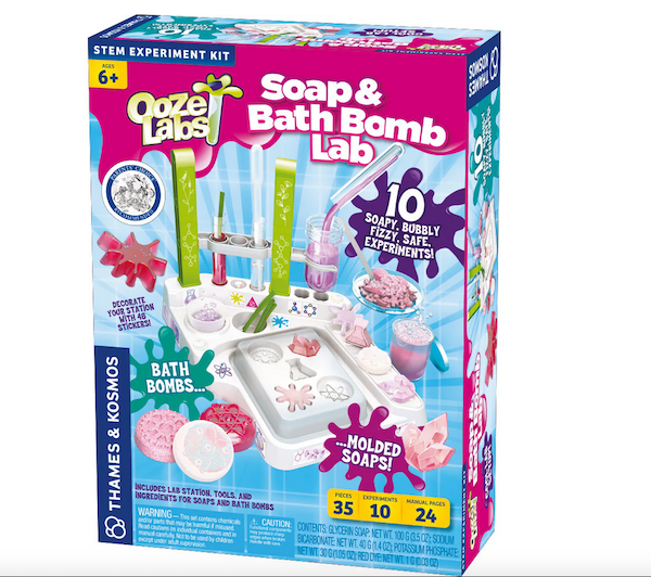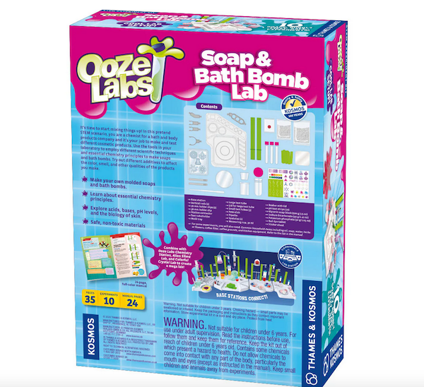 Real science and pretend play come together in this activity-filled kit that can be used alone or as an extension of the Ooze Labs Chemistry Station (a Parents’ Choice Silver Honor winner!). As you mold different glycerin soap shapes, you learn about the chemical properties of soap that help it pick up and wash away dirt. While you’re concocting bath bombs, you learn about how acids and bases combine to form fizzing reactions, and what a pH level is. Expand your cosmetics knowledge with an overview of the biology of skin care and other science related to soap and bath products. All materials and chemicals are non-toxic.